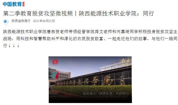 4月21日,我校微视频《同行》入选教育部第二季“我的2020—全国高校师生微视频征集展示活动”,并在全国教育脱贫攻坚微视频展播活动”中展播。这是近年来陕西省高职院校在国家脱贫攻坚成果展示中首个展出的作品。