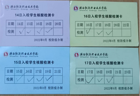 为确保此项工作顺利开展,做到应检尽检、不漏一人,我校后勤保障处制作核酸检测卡发给每个入校学生,分别为红、蓝、黄、绿四种,每天一种颜色。一张小卡片方便提醒学生、方便核酸检测工作管理。