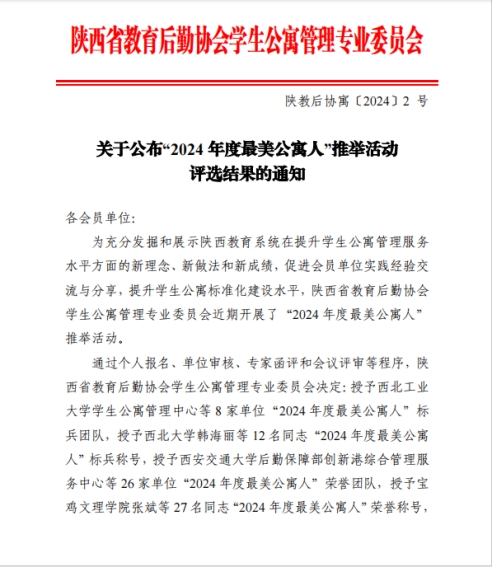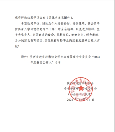 12月31日,我校公寓管理团队在陕西省教育后勤协会学生公寓管理专业委员会“2024年度最美公寓人”评选中脱颖而出,获荣誉团队,公寓管理科何利同志荣获“2024年度最美公寓人”称号。这一荣誉是对我校公寓管理团队辛勤付出的肯定,是该团队致力于为学生创造温馨、安全住宿环境的赞誉。