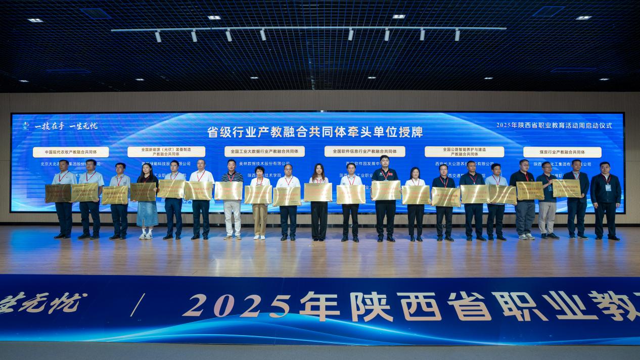 启动仪式上,中共陕西省委教育工委委员、省教育厅副厅长申雪峰出席启动仪式并讲话,陕西省政协副主席、陕西省中华职教社主任李忠民宣布2025年陕西省职业教育活动周启动。西安吉利汽车有限公司领导、职业院校代表、大国工匠及学生代表先后发言。省级10部门领导分别向35个省级行业产教融合共同体和29个市域产教联合体授牌。我校建设的煤炭行业产教融合共同体、康养行业产教融合共同体、食养食疗行业产教融合共同体、乡村医疗卫生行业产教融合共同体、咸阳绿能产教联合体、秦创原高端装备(矿山)人才产教联合体、渭南经开化工产教联合体各牵头单位代表上台接受授牌。会议期间,还启动了“匠心传承,寻找身边的能工巧匠”活动,并为2024年世界职业院校技能大赛金奖获奖项目颁奖。