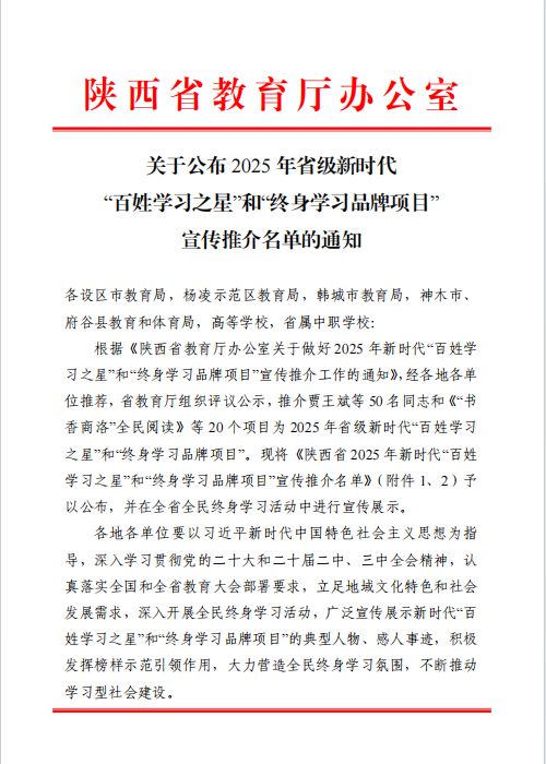 我校入选陕西省2025年新时代“百姓学习之星”和“终身学习品牌项目”
