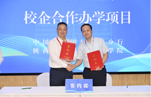 中国建设银行咸阳分行副行长周波(右)与副校长刘浩签署合作办学协议