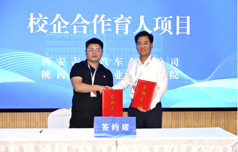 吉利汽车西北区域经理王凯(左)与副校长罗继军签署合作协议