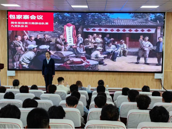 陈家坡会议旧址管理所的老师们通过思政微课、情景朗诵短剧、红色快板等学生喜闻乐见的方式,沉浸式、互动式地进行《弘扬照金精神致敬巾帼英雄》《信念永恒》《马灯闪耀永向前照金精神谱新篇》等主题内容授课,通过陕甘边照金革命根据地老一辈无产阶级革命家的革命故事,生动形象地展示了“忠诚于党的坚定信念,顽强斗争的英雄气概,扎根群众的工作作风”的照金精神,进一步深化了我校学生的爱国主义情怀,筑牢时代青年的理想信念根基。