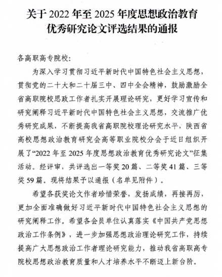 11月12日,陕西省高等学校思想政治教育研究会公布了2022年至2025年度思想政治教育优秀研究论文评选结果。我校7位思政课教师的论文获奖,其中一等奖3项、二等奖2项、三等奖2项,充分展现了我校思政课教师在思想政治理论研究和教学实践方面的扎实积累与创新能力。