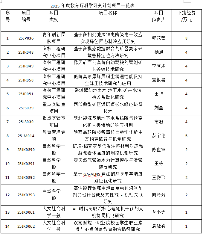 此次获批的14个项目涵盖能源化工、智能机电、医学技术、教育管理等多个领域,紧密对接区域经济发展需求与行业技术创新方向,充分体现了我校“立足能源、服务区域”的科研定位。项目的全面获批,不仅是省教育厅对我校科研创新能力与项目申报质量的高度认可,更彰显了我校教师队伍扎实的科研功底与敏锐的学术洞察力。