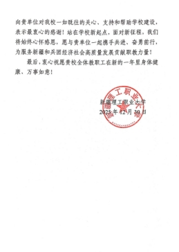 辞旧迎新之际,新疆理工职业大学全体教职工向我校表达了衷心感谢,并期盼未来继续携手前行,共同为服务新疆和兵团经济社会高质量发展贡献职教力量。同时,也向我校全体教职工送上了新年祝福。