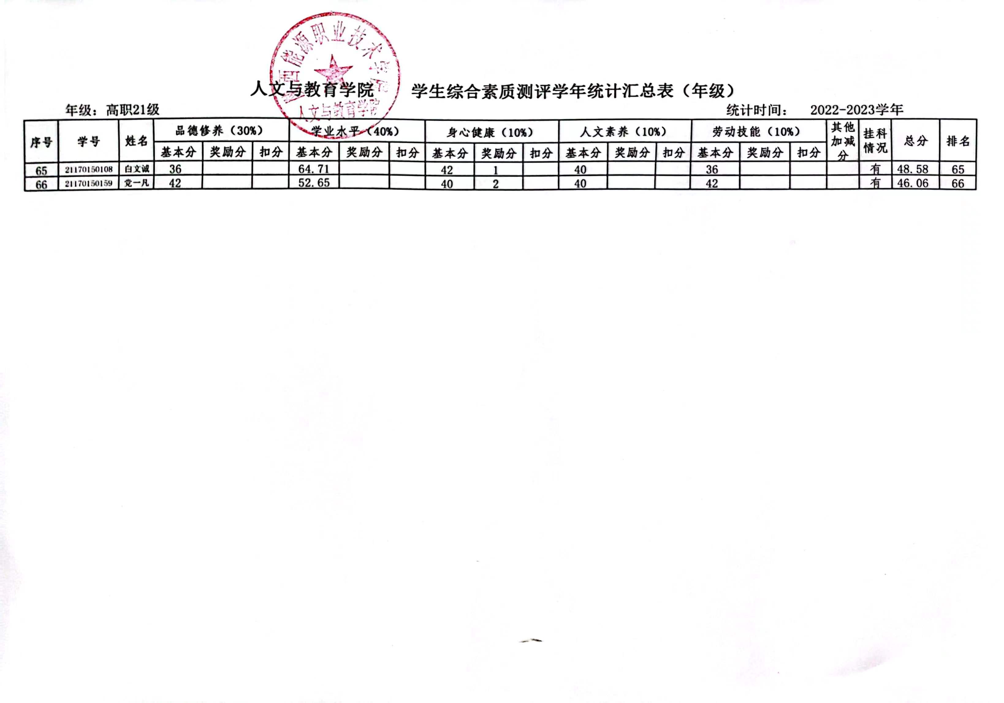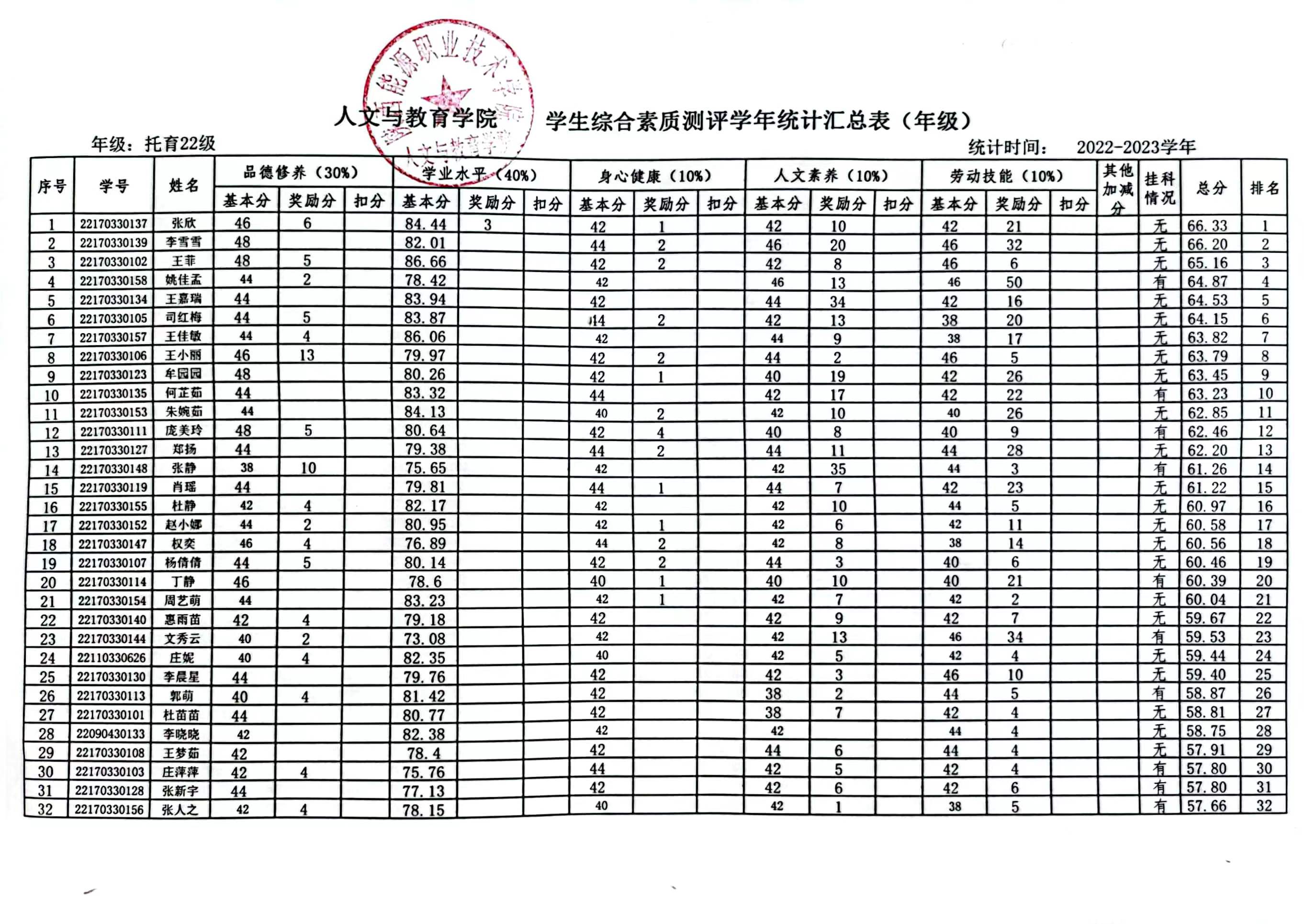 按照《陕西能源职业技术学院学生综合素质测评实施办法(修订)》(陕能院学〔2021〕36号)及学工部《关于做好2022-2023 学年学生综合素质测评总评及年度评优工作的通知》要求,人文与教育学院严格执行文件,认真总结、整理、核算学生综合素质各模块总成绩,经过材料提交、班级鉴定公示及学院审核,现将人文与教育学院学院2022-2023学年学生综合素质测评结果公示如下。