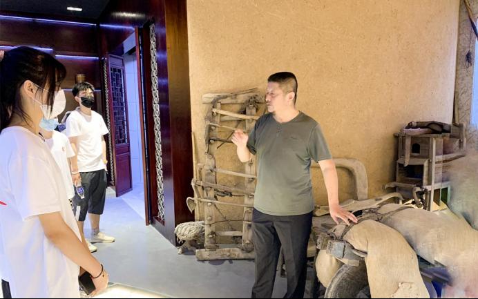 首先队员们来到了非遗文化展厅,展品收藏者陈大新老师向队员们一一介绍展列在馆内的藏品,有石刻孔子像、著名书法家于佑任书写的“诗书垂训”的匾额、木牛流马、八仙桌、三娘教子石雕、五节龙、鎏金柜等,一件件有温度有故事的藏品让队员们赞叹不已。