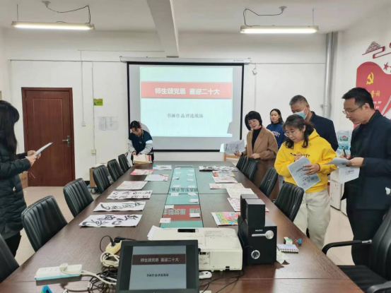 为全面贯彻在美育教育中落实立德树人的根本任务,10月12日下午,人文与教育学院美育中心组织的“师生颂党恩 喜迎二十大”书画作品评选活动在办公楼508会议室举行。评委由我校经济管理学院书记张栋、建筑与测绘工程学院院长李浩、医学技术学院副书记韩晓磊、医学技术学院副院长李蕊、人文与教育学院副院长王利荣组成评审组。