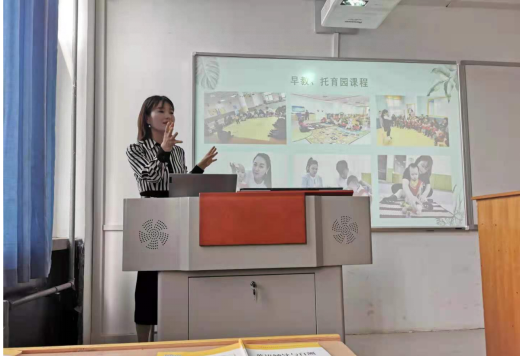 王迎讲座的内容分四个方面:国家托育服务相关政策、托育园与幼儿园课程体系的区分、托育服务与管理人才的能力素质要求、对学生的寄语。