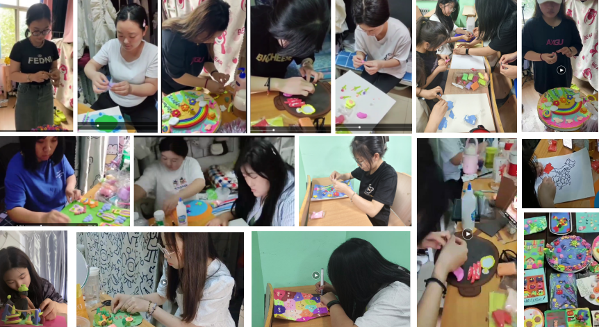 活动前期,将材料发放给每位学生。两个年级学生们拿到材料后,充分发挥想象力,纷纷投入黏土作品制作中。有的同学制作出了栩栩如生的小动物,有的同学则创造出了色彩斑斓的花园景象。更有一些心灵手巧的同学,将粘土与绘画相结合,创作出了别具一格的作品。