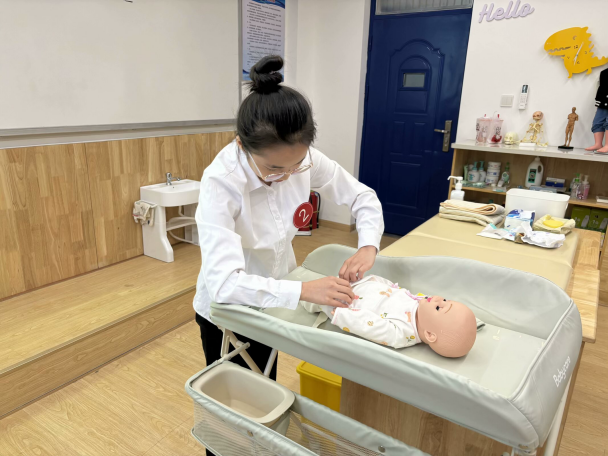比赛分为初赛和决赛两个阶段。初赛阶段,参赛选手们按照规范流程,迅速且轻柔地为仿真婴幼儿更换纸尿裤,一边操作,一边表述着与宝宝交流安抚的要点,选手们动作的熟练程度、细节处理以及与“宝宝”的互动情况均被纳入评委考量范畴。评委老师们则认真观察,从洗手消毒的准备步骤,到纸尿裤穿戴的平整度、防漏侧翼整理,再到更换完成后对“宝宝”的回应性照护,一丝不苟地进行打分,6名选手凭借扎实的基本功脱颖而出,晋级决赛。