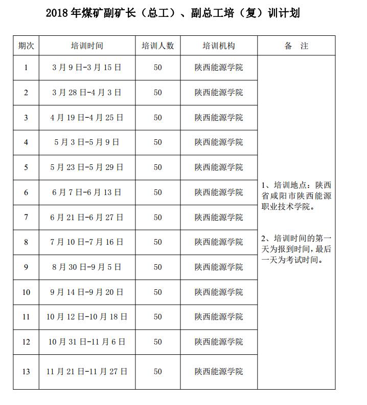 陕西能源职业技术学院安全技术培训中心根据省局有关文件精神,对2018年煤矿安全培训工作进行了安排与部署,并结合我院实际情况,2018年计划在我院举办煤矿煤矿副矿长(总工程师、副总工程师)、煤矿安全生产管理人员培训班(详见附件),我院将严格按照省局要求认真按照培训计划组织培训,严格准入标准,依据规定准备相关资料,经省局考核合格后获取安全生产知识和管理能力考核合格证书。