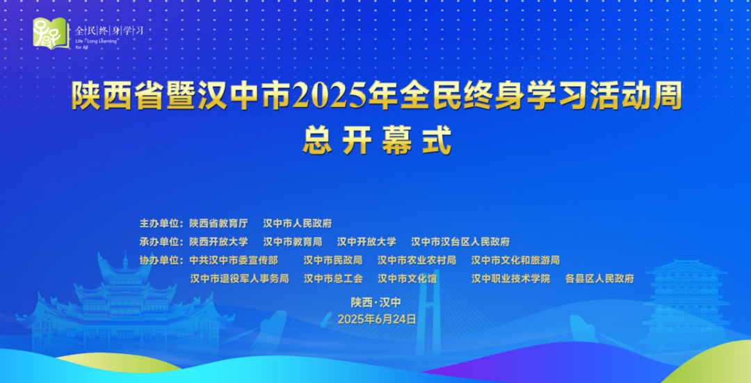 陕西省暨汉中市2025年全民终身学习活动周于6月24日正式启动,此次活动的主题是“让学习成为一种生活方式”。省委教育工委委员、省教育厅副厅长申雪峰出席并讲话。汉中市人民政府副市长郑雪梅致开幕辞。陕西开放大学校长、陕西省社区教育指导中心主任吴宏梅宣读宣传推介名单,省民政厅、省总工会、共青团陕西省委、省科协有关负责同志出席开幕式。