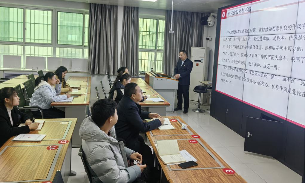 12月5日下午,继续教育学院党总支在培训楼206教室组织全体党员,开展了一场主题鲜明、内容深刻的专题党课学习活动。本次党课由学院党总支副书记吴海龙主讲,以“论作风建设”为核心主题,旨在深化全体党员对党的作风建设极端重要性的认识,厘清党性与作风的内在联系,并探讨在实践中如何弘扬实事求是精神,以进一步增强党性、端正作风。