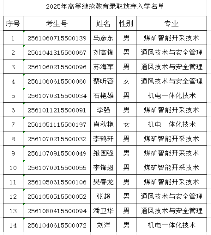 截止3月23日,我校2025年录取成人高等学历教育(非脱产)的下列学员未按规定时间履行报到注册手续。根据《普通高等学校学生管理规定》(中华人民共和国教育部令第41号)以及《陕西能源职业技术学院成人高等教育学生学籍管理规定(修订)》第一章《入学与注册》第一条,该部分学生(名单附后)学校拟按放弃入学资格处理。公示期为2026年3月23日—2026年3月26日。学生如有异议,请在公示期内向继续教育学院或所在教学点反馈,未反馈或未按时反馈视为学生自动放弃入学资格。