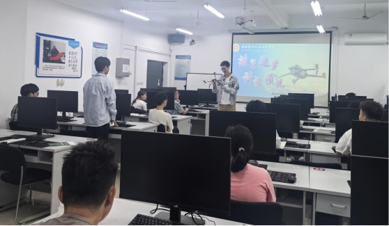 在本次活动中,高雍乐老师以F450四旋翼无人机为载体开展沉浸式教学。通过现场拆解飞行控制器、GPS模块等核心部件,结合三维动画演示飞行力学原理,系统阐释了无人机气动外形优化、多源传感器数据融合及RTK高精度定位技术。无人机在演示中精准完成自主航线规划、三维建模等操作。学生们还围绕"差分定位算法优化""抗风扰姿态控制"等课题展开深度研讨。