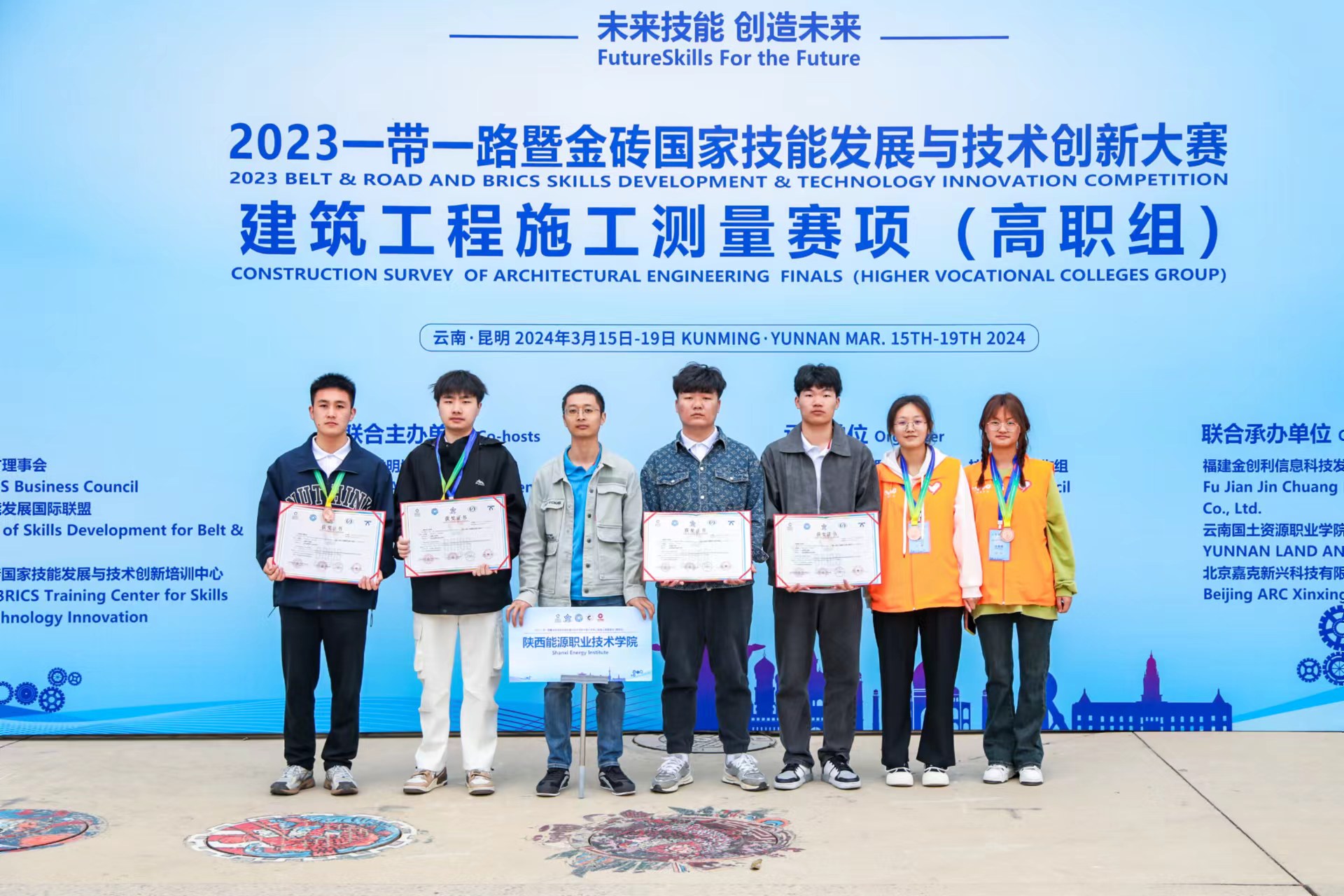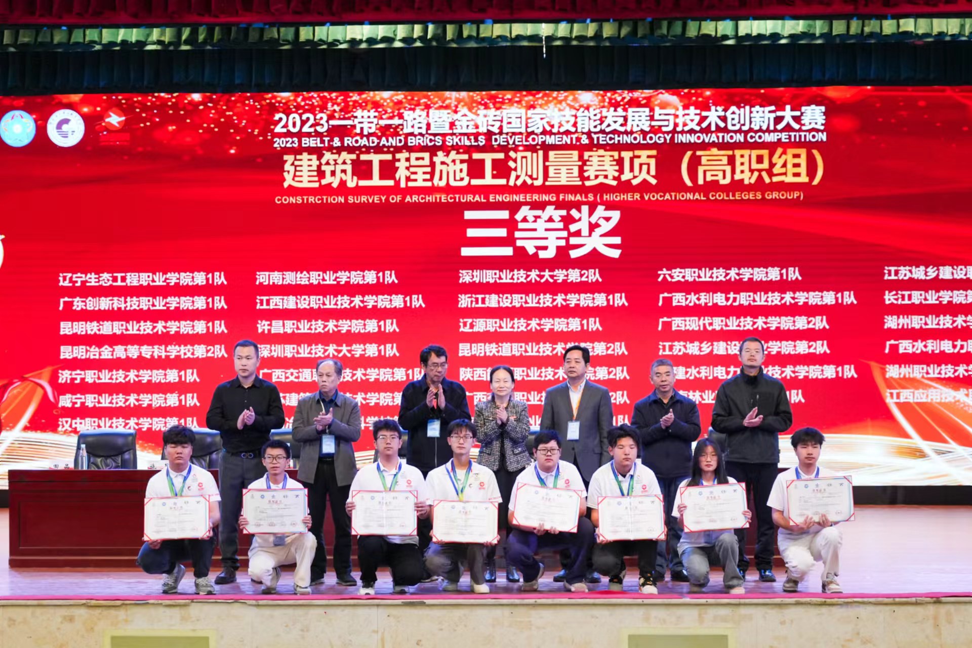 2024年3月下旬,“2023一带一路暨金砖国家技能发展与技术创新大赛”建筑工程施工测量赛项全国决赛,在云南国土资源职业技术学院举行。全国60余所学校110支参赛队进入总决赛,其中测量2201班4名学生,袁福祥、郑玺瑞、宋国强、霍致龙组成的两支参赛队参赛,分别获得三等奖。