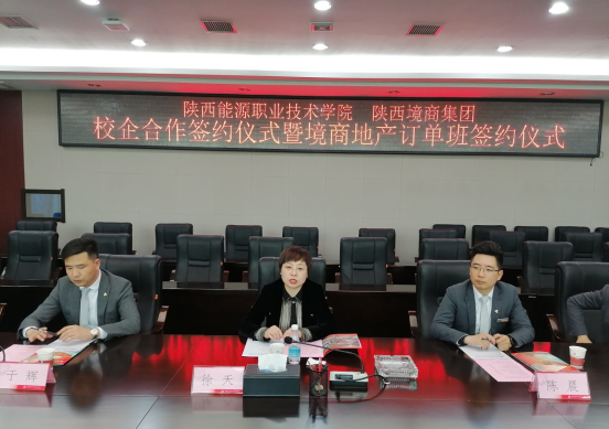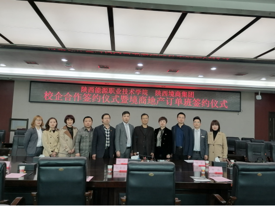 4月9日下午,我校与陕西境商集团校企合作签约仪式暨境商地产订单班签订仪式在办公楼第三会议室举行。陕西境商集团管理公司总经理徐天、人力资源中心总监陈晨、高新大区政委于辉、人力资源中心主管张利娜、人力资源中心校企负责人张喜莹;我校副校长赵新法、校企合作处以及建筑与测绘工程学院主要负责同志出席了签约仪式。