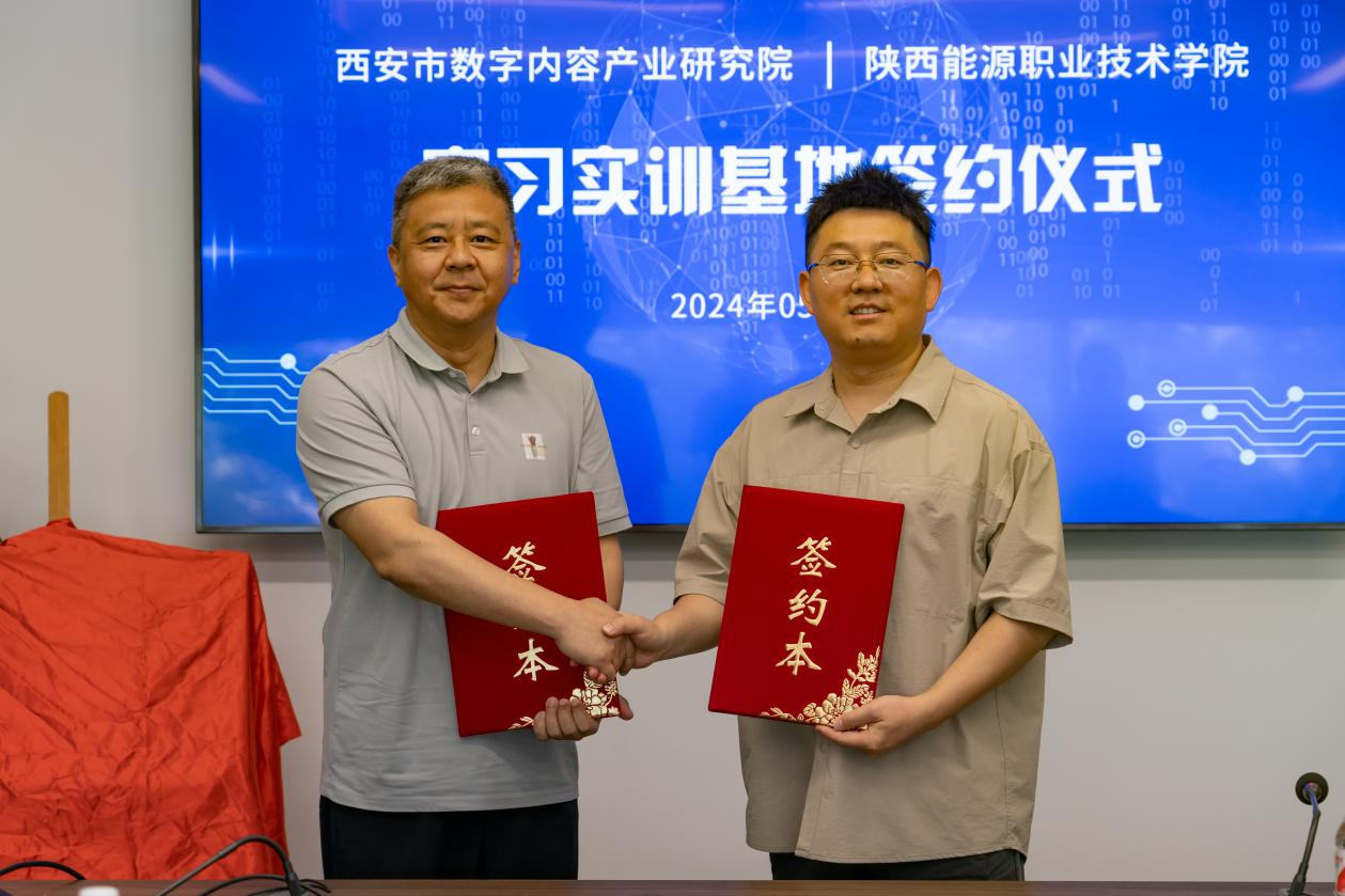 2024年5月24日,受我校副校长李耀辉委托,建筑与测绘工程学院党总支书记肖明宇、建筑艺术教研室主任李珊及综合办主任鬲亚蕾等人员,代表我校与西安市数字内容产业研究院进行了校企合作签约授牌仪式。