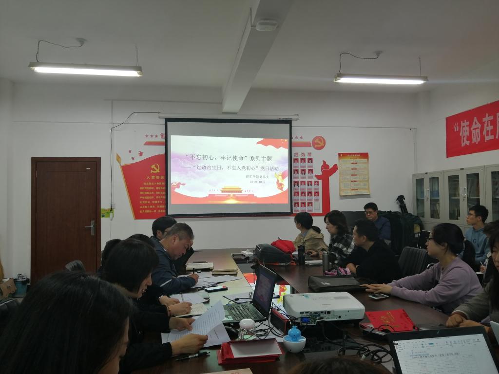 按照学校党委关于开展“不忘初心、牢记使命”主题教育实施方案的通知要求,结合支部“不忘初心、牢记使命”主题教育学习计划,2019年10月9日下午,建工学院全体党员在办公楼515会议室举行“不忘初心、牢记使命”主题教育—“过政治生日,不忘入党初心”党日活动。活动由教工党支部书记王洁主持。
