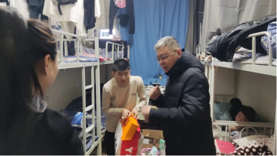 关爱学子做实事,冬日寒衣暖人心。为深入宣传党和国家的资助政策,进一步了解家庭经济困难学生的实际情况,推进精准资助工作,强化资助育人效果,同时了解同学们的学习、生活及思想方面的状况。12月5日晚,建筑与测绘工程学院党总支书记肖明宇、学工办主任张嬉以及辅导员代表深入学生宿舍,慰问2023级部分学生并发放御寒保暖爱心礼包。
