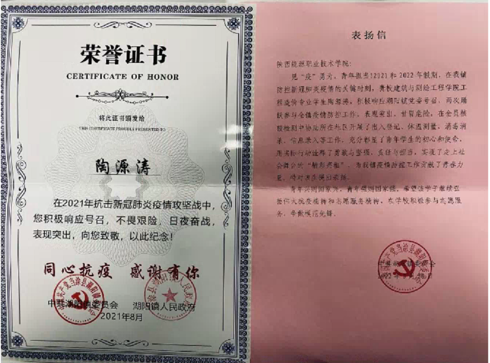 我校建筑与测绘工程学院收到了来自安徽省马鞍山市当涂县湖阳镇发来的表扬信,信中对我校造价2001班陶源涛同学在疫情期间积极参与疫情防控工作的给予高度评价,并对我校培养出优秀学子表示感谢。
