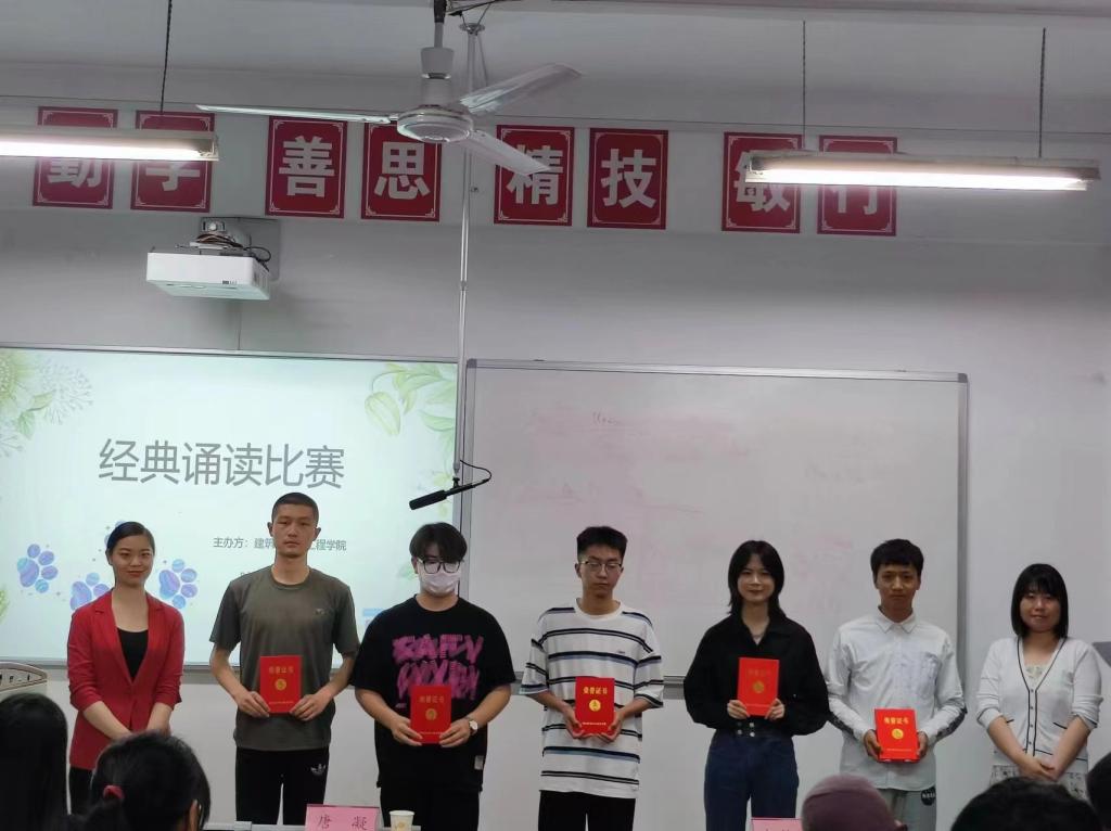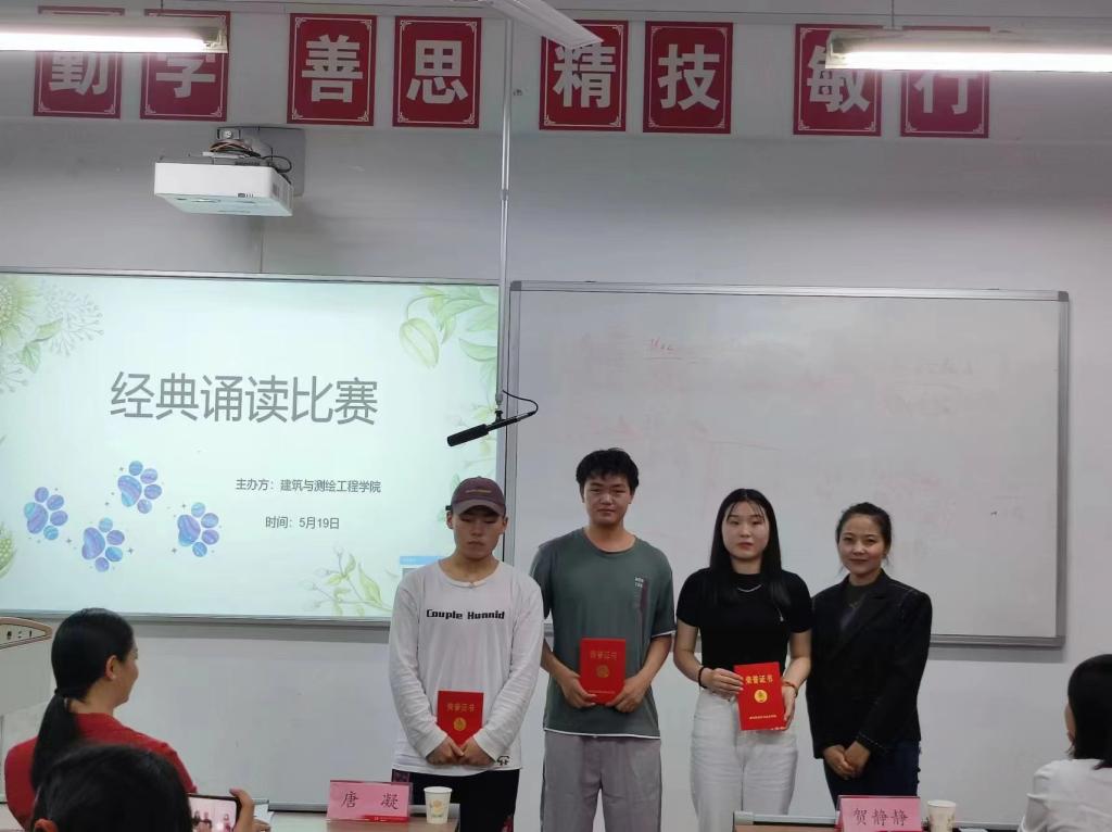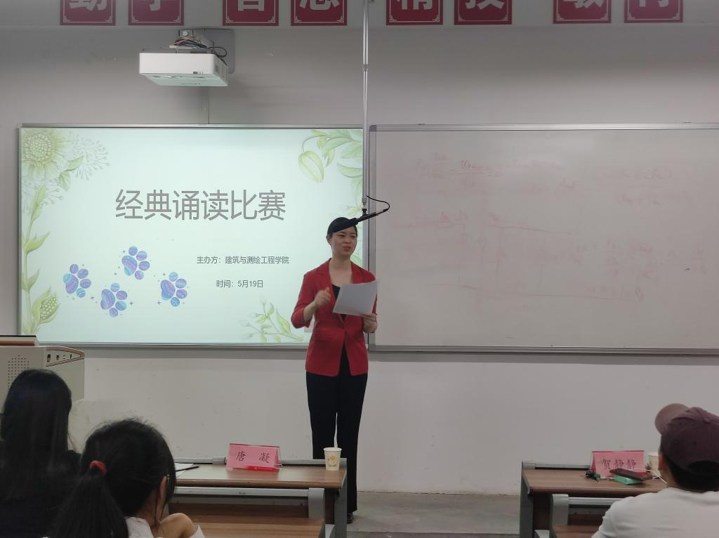 为增强广大学生的爱国情怀,提高学生文化自信,建筑与测绘工程学院于519日晚在教学楼116举办了国学经典朗诵比赛。此次比赛共有来自建测学院2021级的16位参赛选手,邀请了唐凝、袁茵以及贺静静老师三位老师作为评委。此外,建测学院党总支书记买中傲、全体建测辅导员共同参加了此次活动。