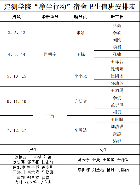 学院安排“净尘行动”宿舍卫生班主任值班表,组织班主任对学生宿舍卫生进行检查,督促学生保持宿舍的整洁与卫生。