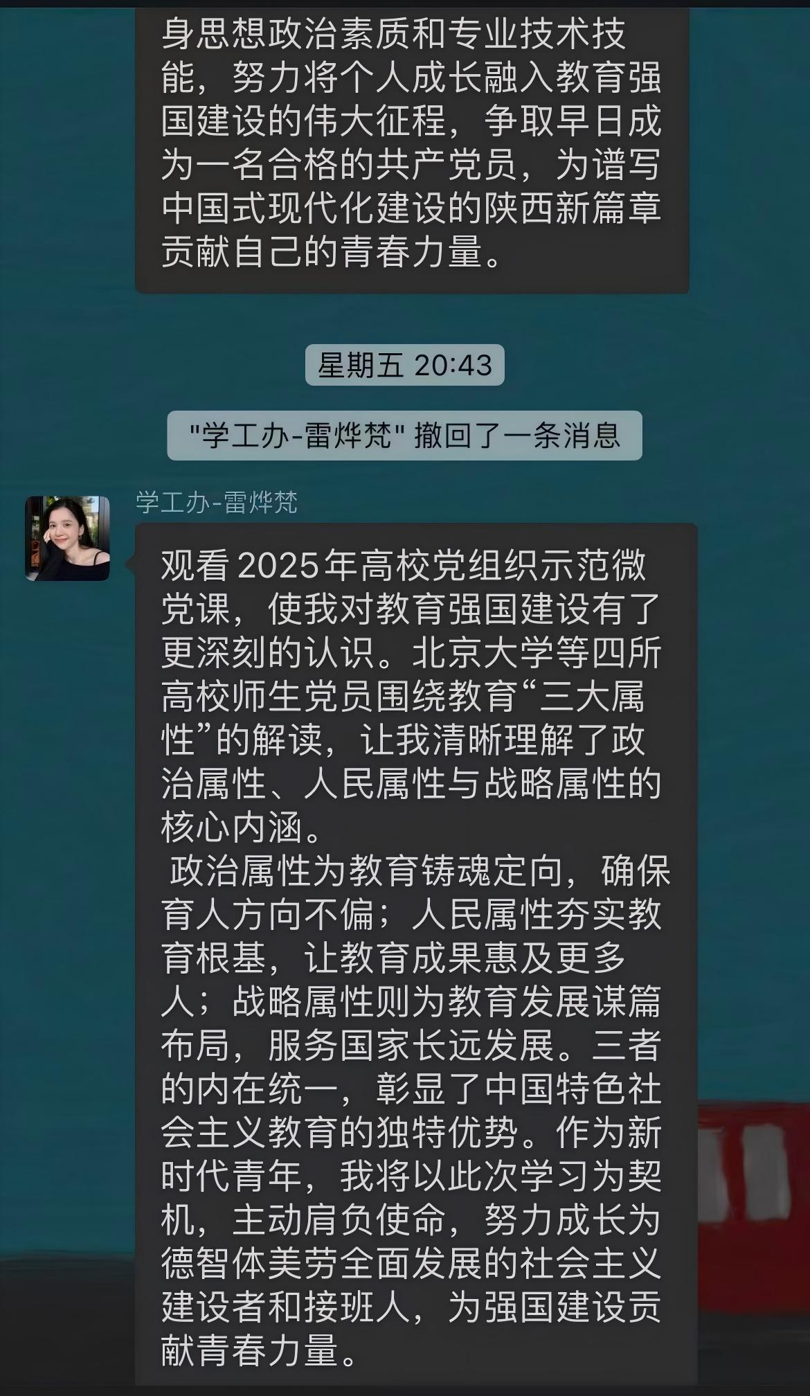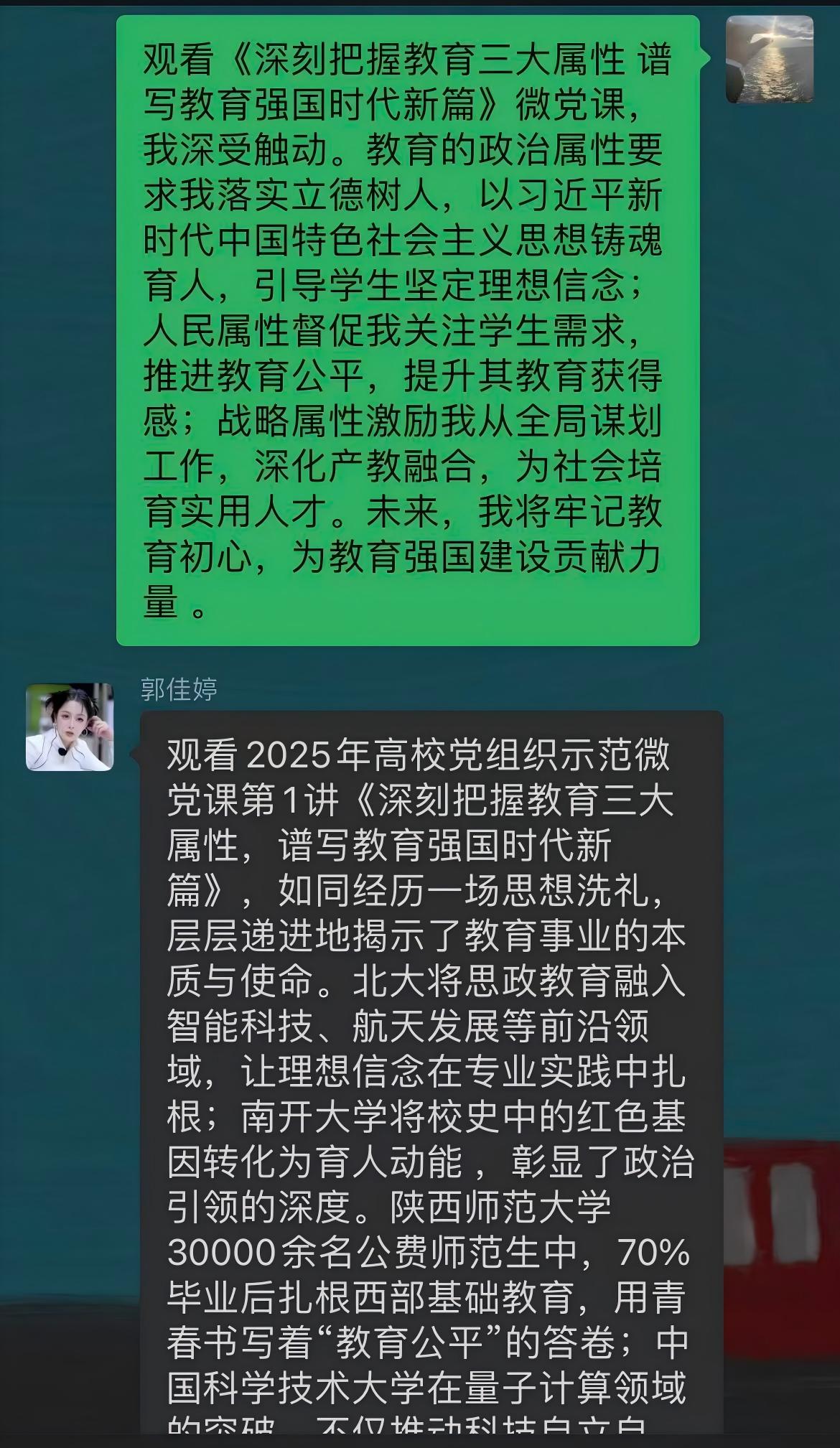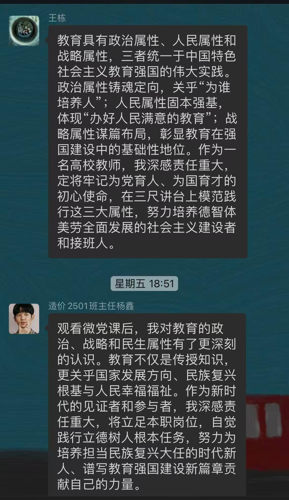 观看结束后,师生们深受启发,在学习群内踊跃分享心得。教师党员们纷纷表示:“深刻认识到教育工作者肩负的重大使命,要坚守教育初心,立德树人,为党育人、为国育才。” 学生党员们则分享:“我们要严格要求自己,努力学习专业知识,在学生中发挥模范带头作用。” 入党积极分子们也表示:“此次学习坚定了我入党的决心,我将以党员标准严格要求自己,以实际行动锻炼自己。”