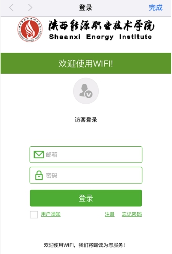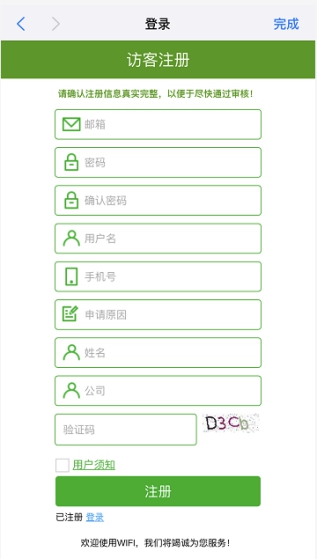 访客需连接名为NYXY-Guest的无线网络,在弹出的访客认证页面点击注册进入访客注册页面。