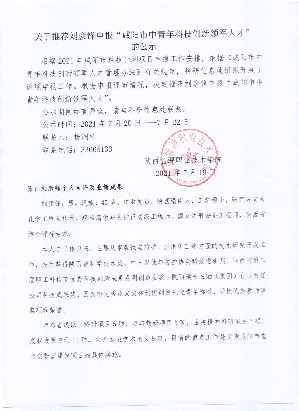 关于推荐刘彦锋申报“咸阳市中青年科技创新领军人才”的公示