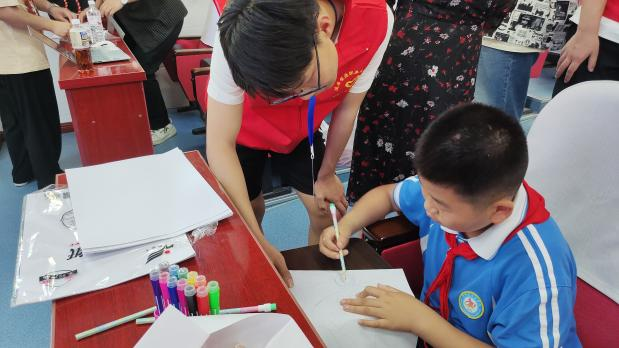 活动开始,志愿者们发放作画工具,并引导同学们大胆勾勒、以手绘心,用一支支五彩斑斓的画笔创作心中“党的红色印记”,他们用奇思妙想构思出了美妙的世界。每一幅作品都独具风格,有的构图大胆,对比鲜明;有的活泼可爱,色彩明丽;有的画风时尚,柔韧有余,展现出小画家细腻的心思与大胆的想象,表达了他们对绘画艺术的热爱之情以及对党、对祖国的热爱与对未来的畅想。