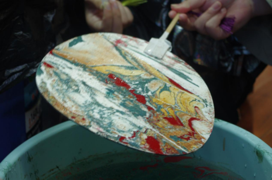 飘漆是利用漆不溶于水的特质,以点、甩、弹、划等手法,在水面绘出图案效果,以扇子为载体,通过漂流漆技法,这样制作出的扇面,都是独一无二的。