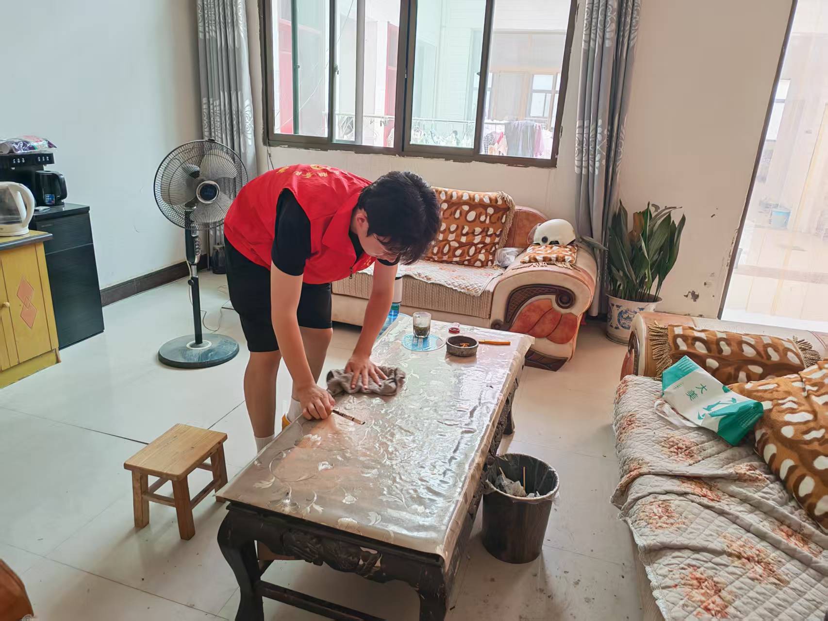 居家环境清洁: 志愿者们细致地为老人打扫院落、擦拭门窗桌椅,改善居住环境。
