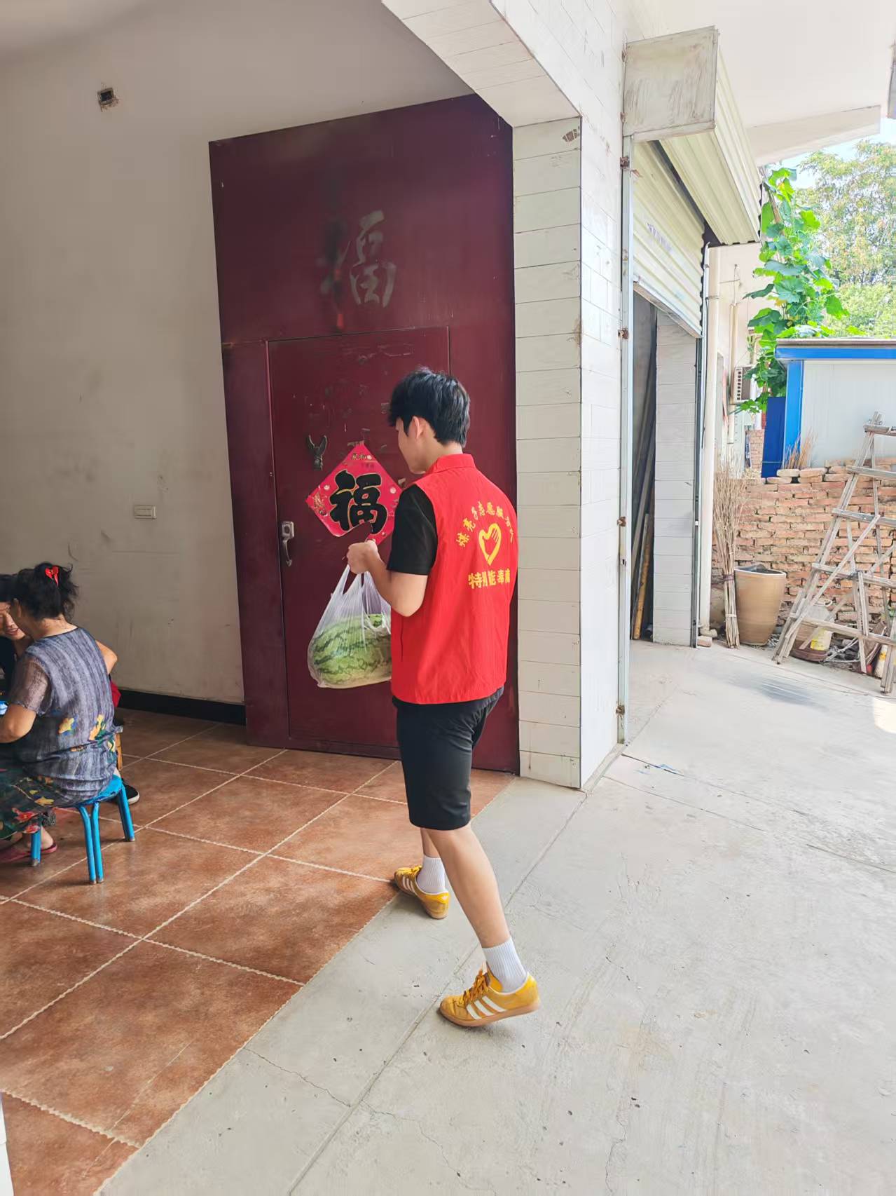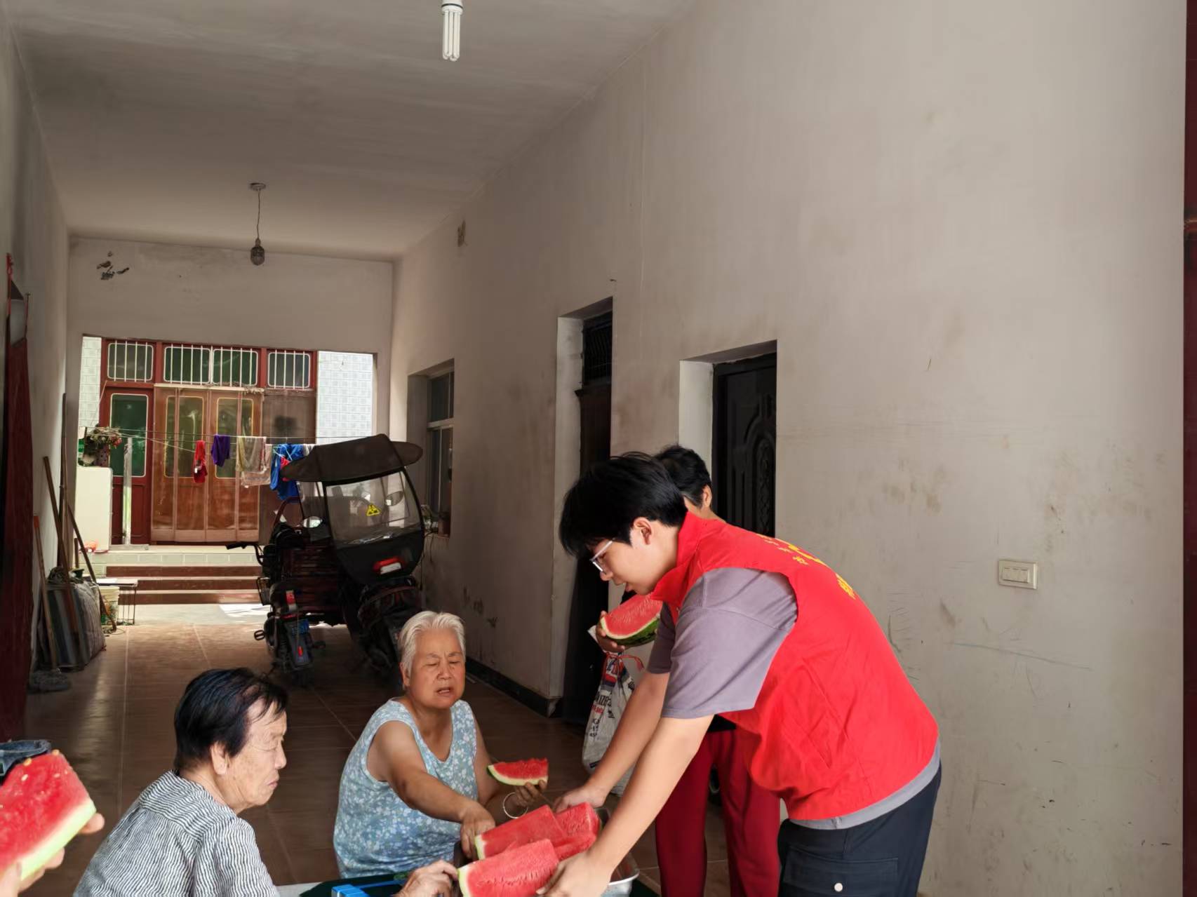 夏日清凉关怀: 队员们特意为老人送去新鲜西瓜,在炎炎夏日带来一丝清凉与甘甜。