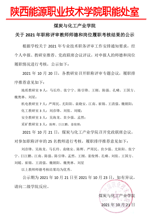 煤炭与化工产业学院关于2021年职称评审教师师德和岗位履职考核结果的公示
