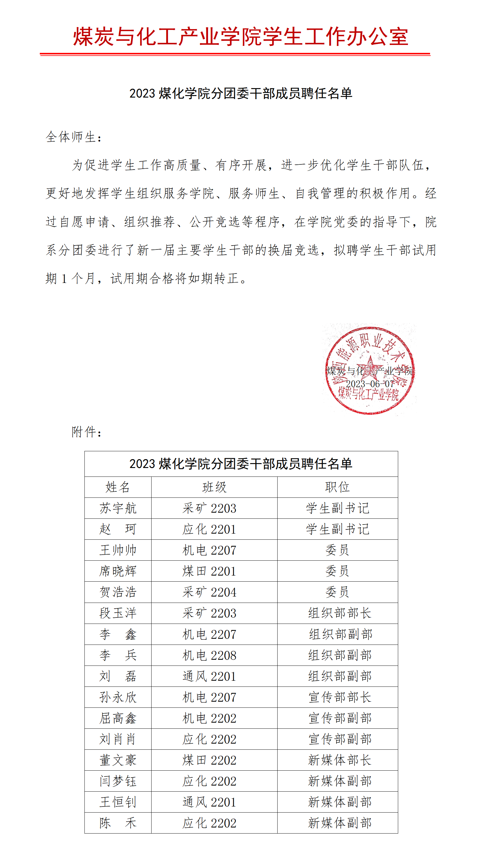 2023煤化学院分团委干部拟聘任名单公示