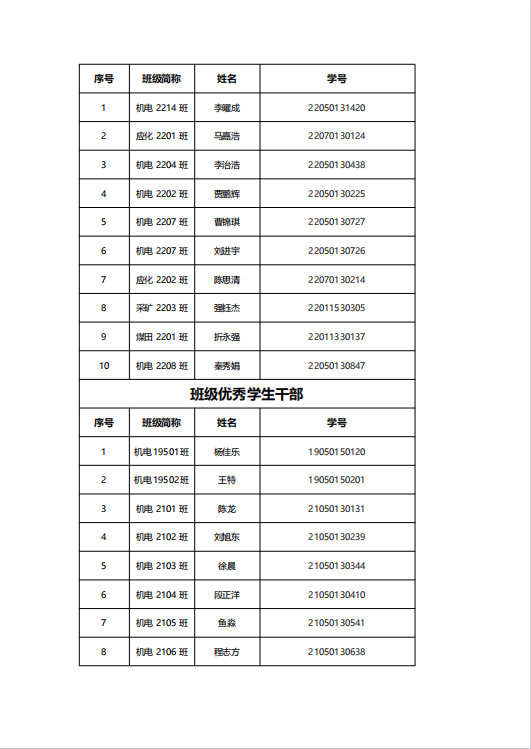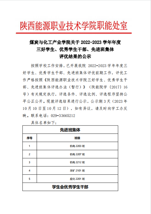 按照学校工作安排,已开展我院 2022-2023学年年度三好学生、优秀学生干部、先进班集体评优前期工作,评优工作严格按照《陕西能源职业技术学院三好学生、优秀学生干部、先进班集体评选办法(暂行)》(陕能院学〔2017〕16 号)有关规定执行,评选条件、评选比例、评选程序坚持公平公正公开。现就评选结果进行公示,此公示名单为煤化学院拟公示名单,最终名单需要等学校的最终公示。公示期3天(2023年10月10日至10月12日),如有异议,请及时向学工办反映。