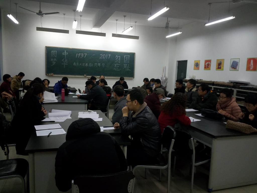 2017年12月13日是南京大屠杀死难者国家公祭日80周年纪念日,是中国国家公祭日,本支部全体党员及教师在地质实验室共同吊唁南京大屠杀的死难同胞,全体党员及实践教学管理处其他教师共同默哀一分钟。