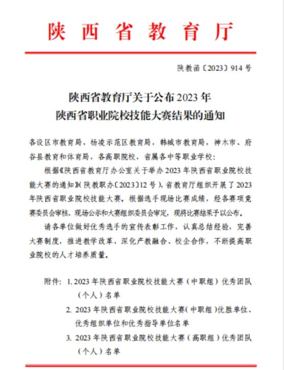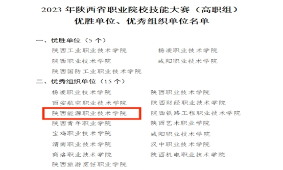 近日,由省教育厅组织开展的2023 年陕西省职业院校技能大赛成绩公布。我校139名选手在31个赛项中荣获一等奖11项、二等奖16项,三等奖28项,共计55个大赛奖项的优异成绩,同时我校被授予“高职组”优秀组织单位,“中职组”优秀指导单位,实现了在省级技能大赛层面的新突破。