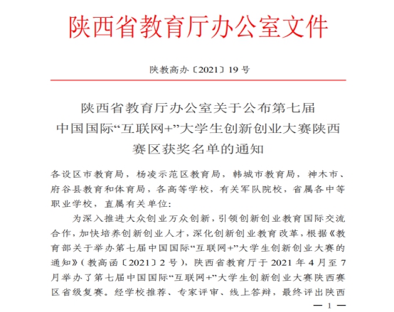 “由陕西省教育厅主办,西安交通大学承办的“建行杯”第七届中国国际“互联网+”大学生创新创业大赛于8月上旬在西安交通大学圆满闭幕。我校参加了4个赛道中的“职教”和“青年红色筑梦之旅”两个赛道,荣获金奖1项、银奖1项、铜奖7项。