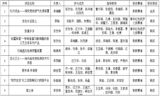 本次比赛全校共报名309个项目,经过二级学院初赛、校赛及省赛赛前遴选打磨等阶段,最终推荐“引绳器及检测预警装置”、“走在长征路上”等10个项目参加省级复赛。省级复赛阶段,“化污成金—煤炭燃烧废气处理装置”项目获得职教赛道金奖;“走在长征路上”项目获得“青年红色筑梦之旅"赛道银奖;是我校在此赛事上的最好成绩。