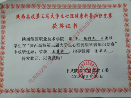 5月30日,我校在省高教工委组织的心理知识竞赛中获得高职组二等奖。第三届陕西高校心理健康科普知识竞赛在西北工业大学友谊校区举行,来自全省38所高校的上百名名选手参加本次比赛。经过激烈考试角逐。由我院辅导员老师景安琪指导的杨彩文、梁尧和王清煜同学组成的代表队荣获三等奖,景安琪同志获得“优秀指导教师”。