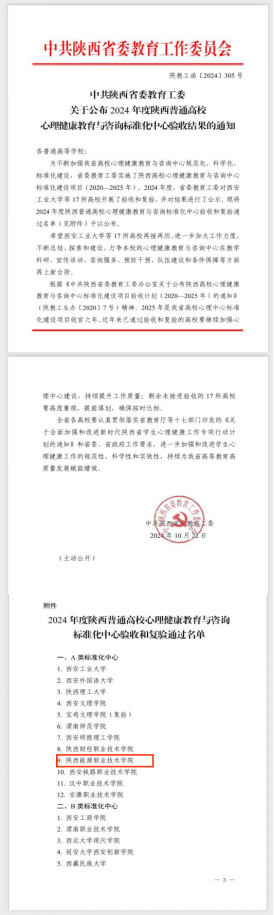 近日,中共陕西省委教育工委公布了 2024年度陕西普通高校心理健康教育与咨询标准化中心验收结果(陕教工函〔2024〕305号),我校心理健康教育中心以94分的优异成绩通过陕西省普通高校标准化中心定级(A类)验收,获评“陕西普通高校心理健康教育与咨询A类标准化中心”。