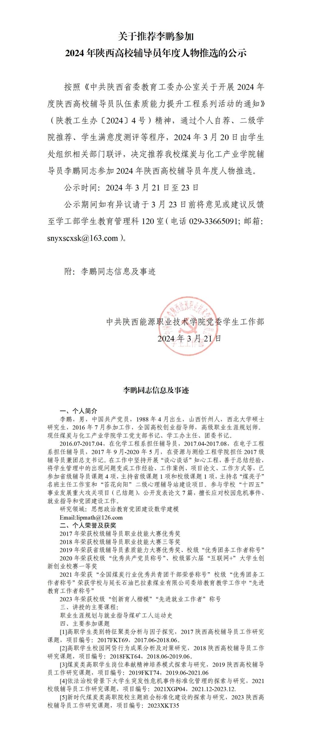 关于推荐李鹏参加2024年陕西高校辅导员年度人物推选的公示