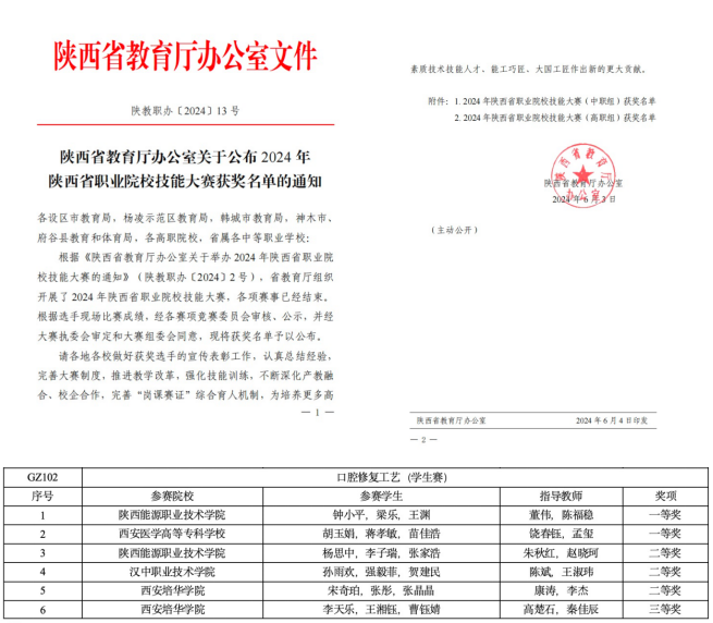 技能大赛荣获2024年陕西省职业院校技能大赛口腔修复工艺赛项一等奖1项,二等奖1项。黄河流域产教联盟高职学生技能邀请赛口腔修复工艺赛项行业赛二等奖1项。全国口腔医学技术技能大赛二等奖2项,三等奖2项。