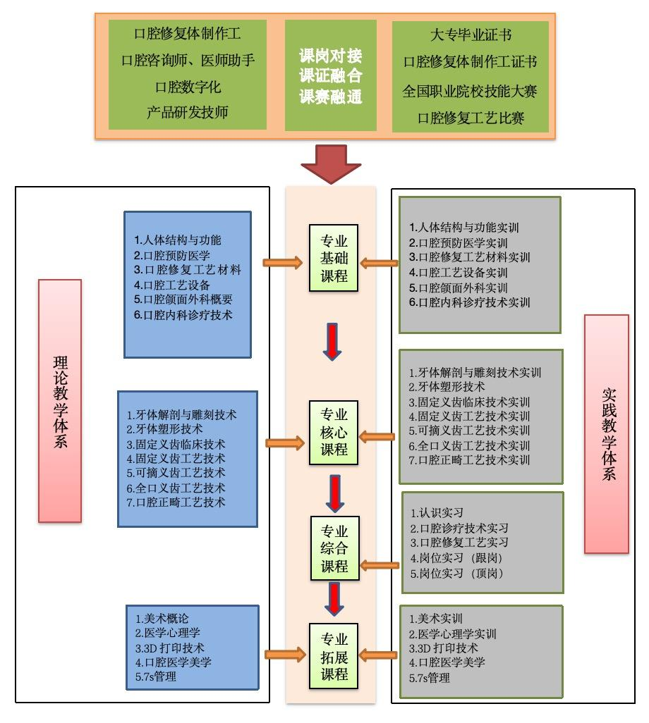 培养目标:本专业培养德智体美劳全面发展,掌握扎实的科学文化基础和口腔临床医学、口腔医学技术等知识,具备口腔修复体及各种矫治装置的设计与制作等能力,具有敬佑生命、救死扶伤、甘于奉献、大爱无疆的职业精神及信息素养,能够从事口腔修复体及矫治器的设计制作、参与口腔及颌面部常见疾病诊疗、进行口腔预防保健的科普教育等工作的高素质技术技能人才。