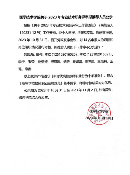 医学技术学院2023年专业技术职务评审拟推荐人员公示